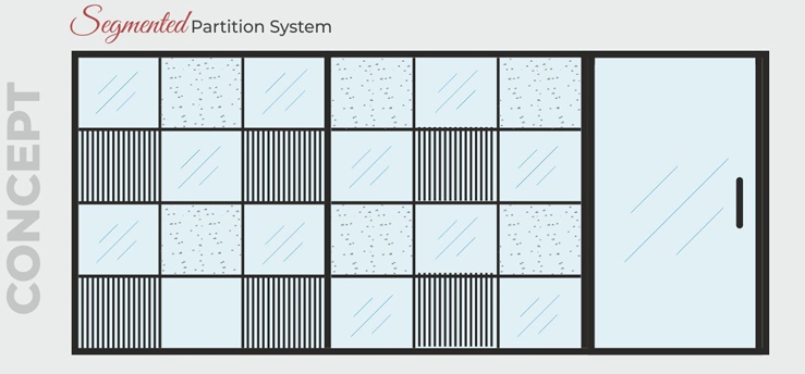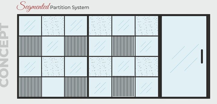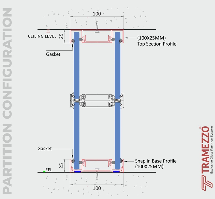 The TRAMEZZO 100×25 Segmented (Double Glaze) system is engineered for offices requiring high acoustic performance and structured spatial division. Its segmented design introduces visual organization while retaining transparency.