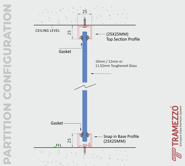 The TRAMEZZO 25×25 Exclusive System is a refined and lightweight glass partition solution designed for minimalistic and contemporary interiors. Based on an Exclusive Partition System with a 25mm × 25mm glazing seal and bead, this system delivers clean lines, precision detailing, and a balanced visual presence.