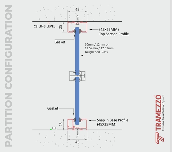 The TRAMEZZO 45×25 Segmented System offers a structured glass partition design using segmented visual breaks within a single-glazed system. Built for normal office use, it helps organize spaces while preserving transparency.
