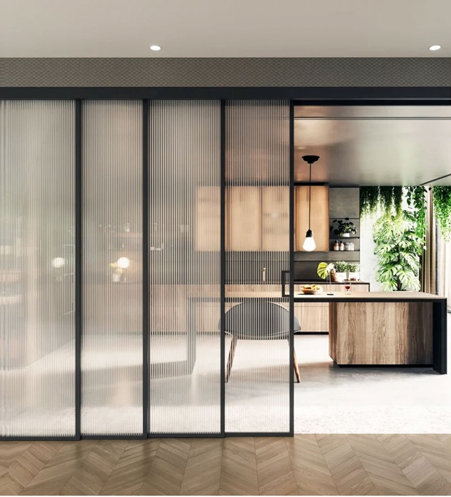 It offers smooth operation and design flexibility, making it suitable for modern commercial and residential interiors.